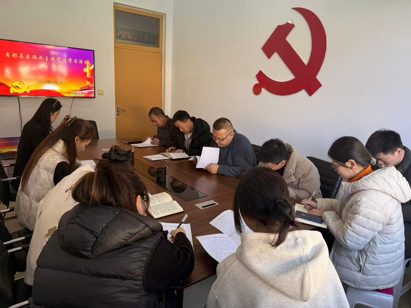 为深入学习习近平新时代中国特色社会主义思想,引导全体党员干部进一步深化思想认识,牢固树立和践行正确政绩观,3月6日,县委编办召开3月份主题党日活动,组织全体党员干部研读《习近平谈治国理政》第五卷专题七、八的内容,学习《习近平总书记在二〇二六年春节拜团会上的讲话》、《求是》杂志刊发的《当前经济工作的重点任务》,以及中办印发的《在全党开展树立和践行正确政绩观学习教育的通知》。